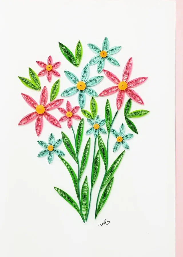 Bring a smile with this playful 5x7 quilled greeting card featuring a vibrant bunch of pink and blue flowers. Each petal is carefully crafted with colorful paper quilling, creating a lively bouquet that pops off the card. Perfect for brightening any occasion, this cheerful design adds a fun and floral touch to your heartfelt message.