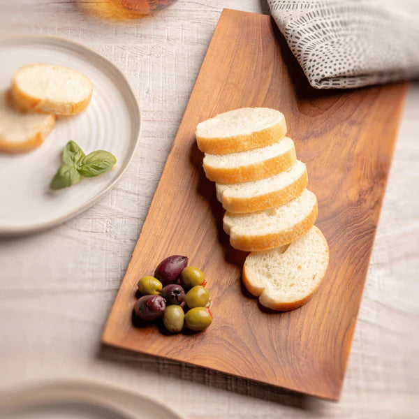 These rectangular trays are transformed into works of art by teak wood's fine grain and unique, natural marks. Handmade by talented artisans in Bali, the Bali Teak rectangular tray is distinctive yet elegant, making it ideal for everyday events, entertaining, or home décor. A beautiful artisanal tray perfect for serving snacks, charcuterie, or hors d'oeuvres.