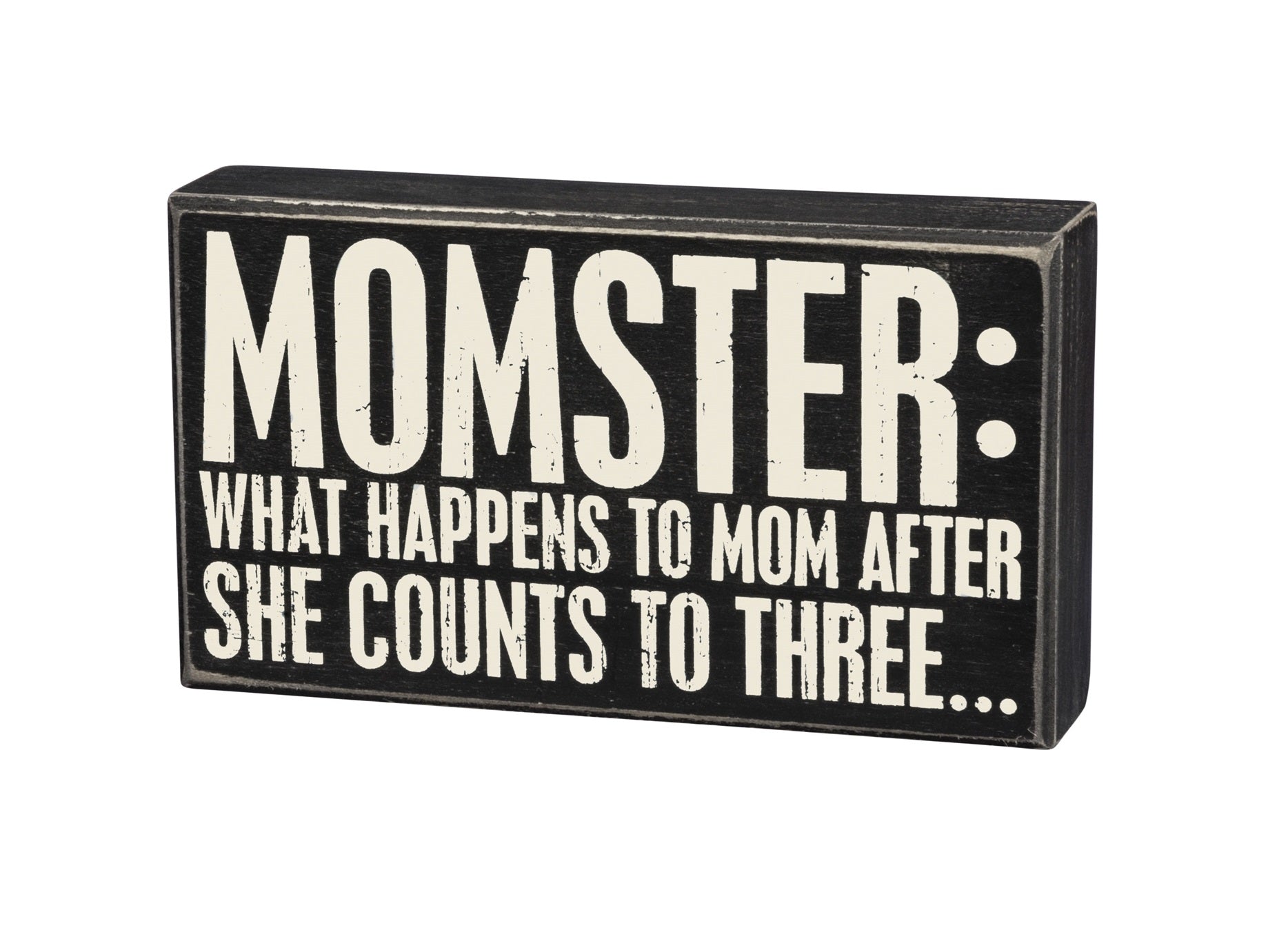 A classic black and white wooden box sign featuring a distressed "Momster: What Happens To Mom After She Counts To Three..." sentiment. Easy to hang or can free-stand alone.