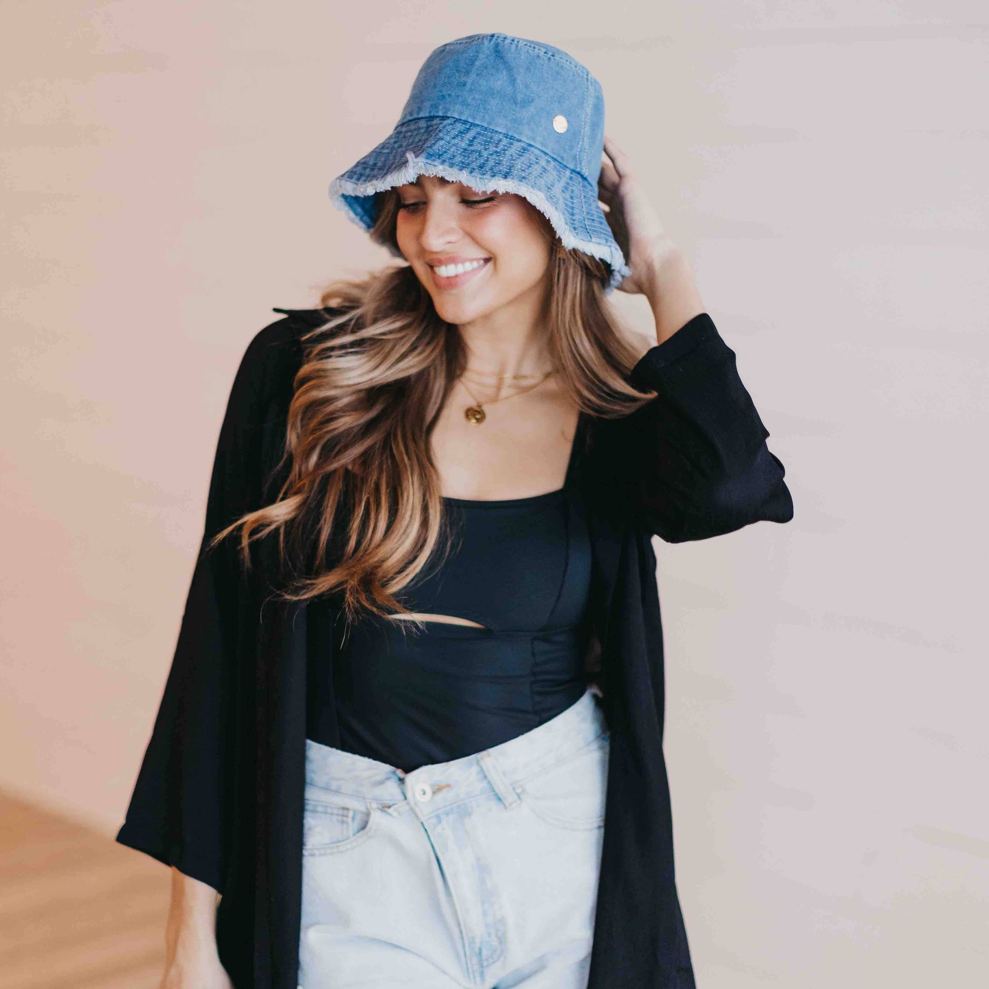This denim fringe hat is the perfect summer accessory. It is adjustable, lightweight, and great for a day by the water or as an outfit completer!