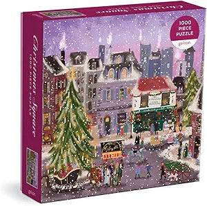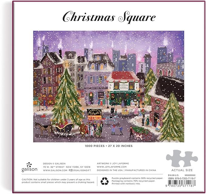 The Christmas Square 1000 Piece Puzzle in Square Box by Galison features by Joy Laforme of a charming village during the holidays, complete with lit Christmas trees, falling snow, carolers, smoking chimneys and more. Galison puzzles are packaged in matte-finish sturdy boxes, perfect for gifting, reuse, and storage. An insert of the full puzzle image is also included.