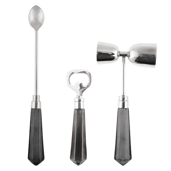 Harper Bar Tools are the backbone to any great bar cart. Including one long-neck stirring spoon, bottle opener and duel-sided jigger, this set is the perfect start to building a collection of cocktail basics. Each tool is made with glass handles and stainless steel for a durable and classic look. Mix up your favorite drinks to end a long day or celebrate with friends and family.