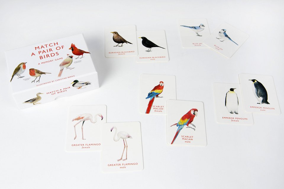 Match the male and female pairs of 25 species of bird from around the world in this beautifully illustrated memory game. To play, simply place the cards face down and see if you can remember where the matching bird is located. Collect more pairs than your opponent to win!