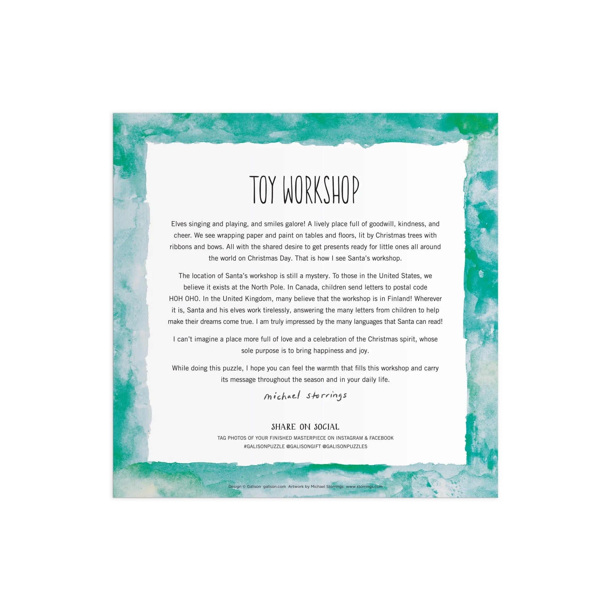 Michael Storrings Toy Workshop 500 Piece Puzzle by Galison features the spirit of a toy workshop, embellished with frosty foil accents. This puzzle is just the right level of challenge for the whole family to join in on for hours of puzzling fun! The box includes an insert with the full puzzle image for reference.
