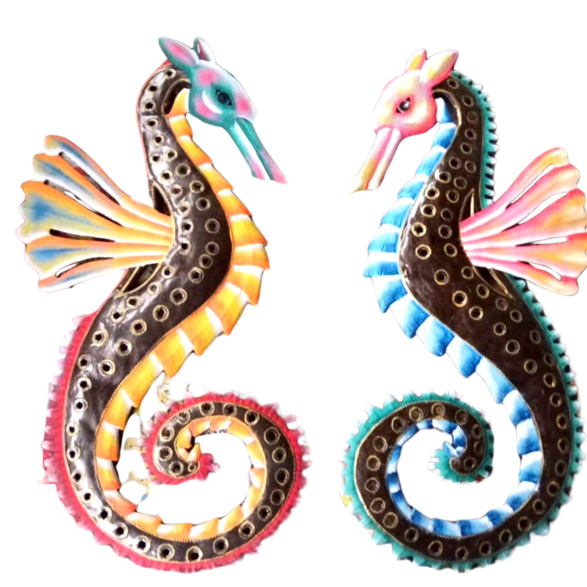 Painted Vibrant Seahorses are two painted seahorse metal art pieces sold as a set. A gorgeously detailed and vibrantly painted sea-themed metal art set.