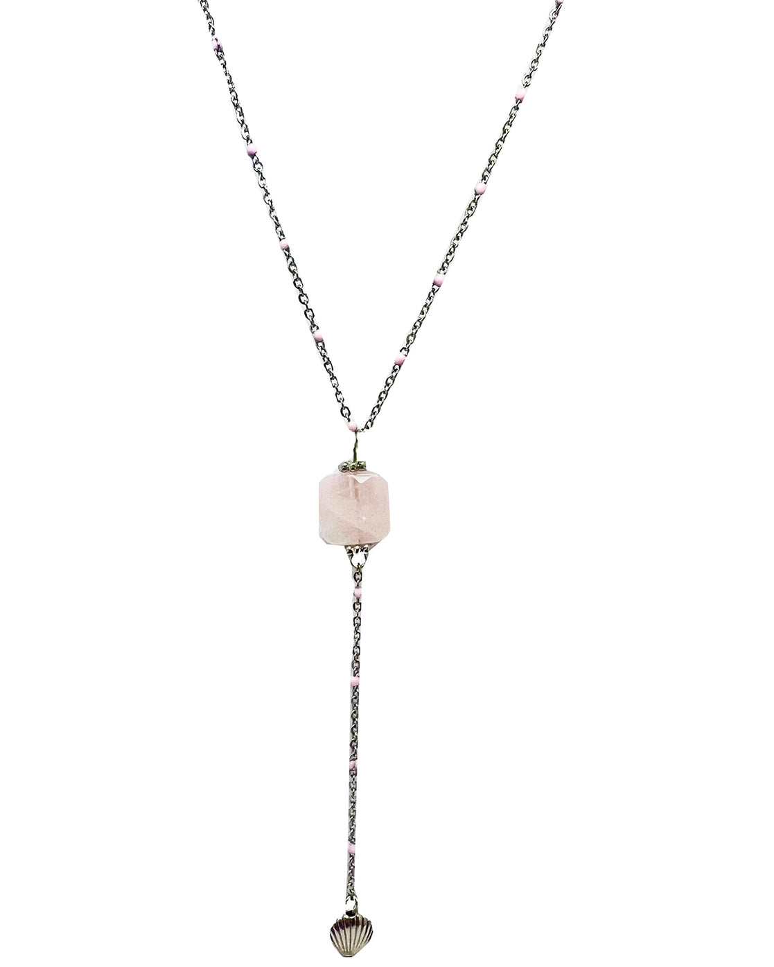 Add a touch of seaside charm with this unique necklace featuring a mini silver shell (perfect for mermaid vibes) hanging down from a genuine rose quartz stone on a delicate silver chain with dainty pink beads.