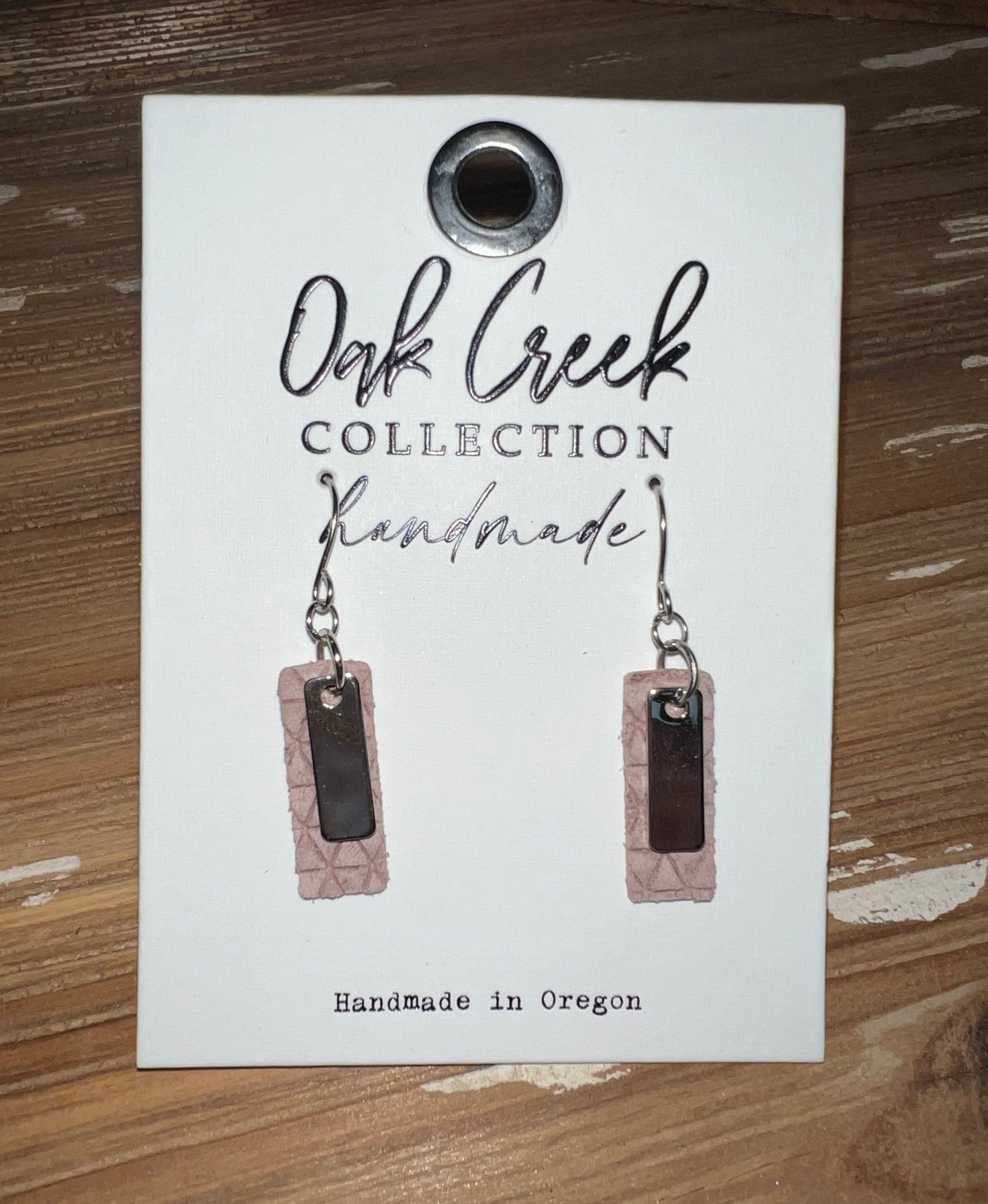 These handmade earrings feature a silver bar detail with textured mauve leather.