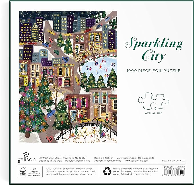 The Sparkling City 1000 Piece Foil Puzzle from bestselling artist Joy Laforme features gold foil accents on a shimmering image of colorful merriment in the city. Galison puzzles are packaged in matte-finish sturdy boxes, perfect for gifting, reuse, and storage.
