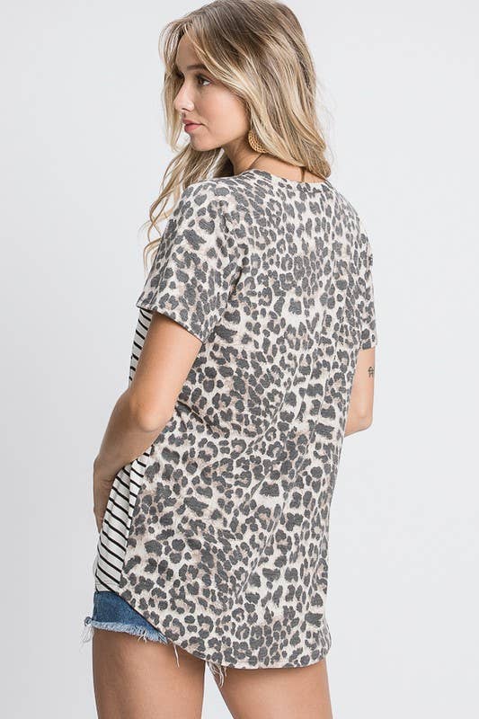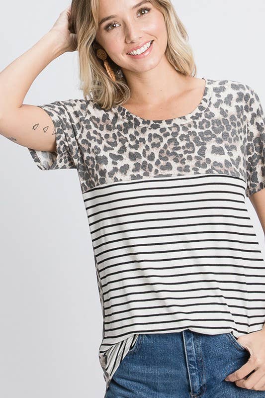 Add a wild twist to your wardrobe with this playful short sleeve top featuring a bold leopard print and contrasting stripes. Its round neck design keeps it comfy and casual, perfect for mixing and matching with your favorite jeans or skirts for a fun, standout look.