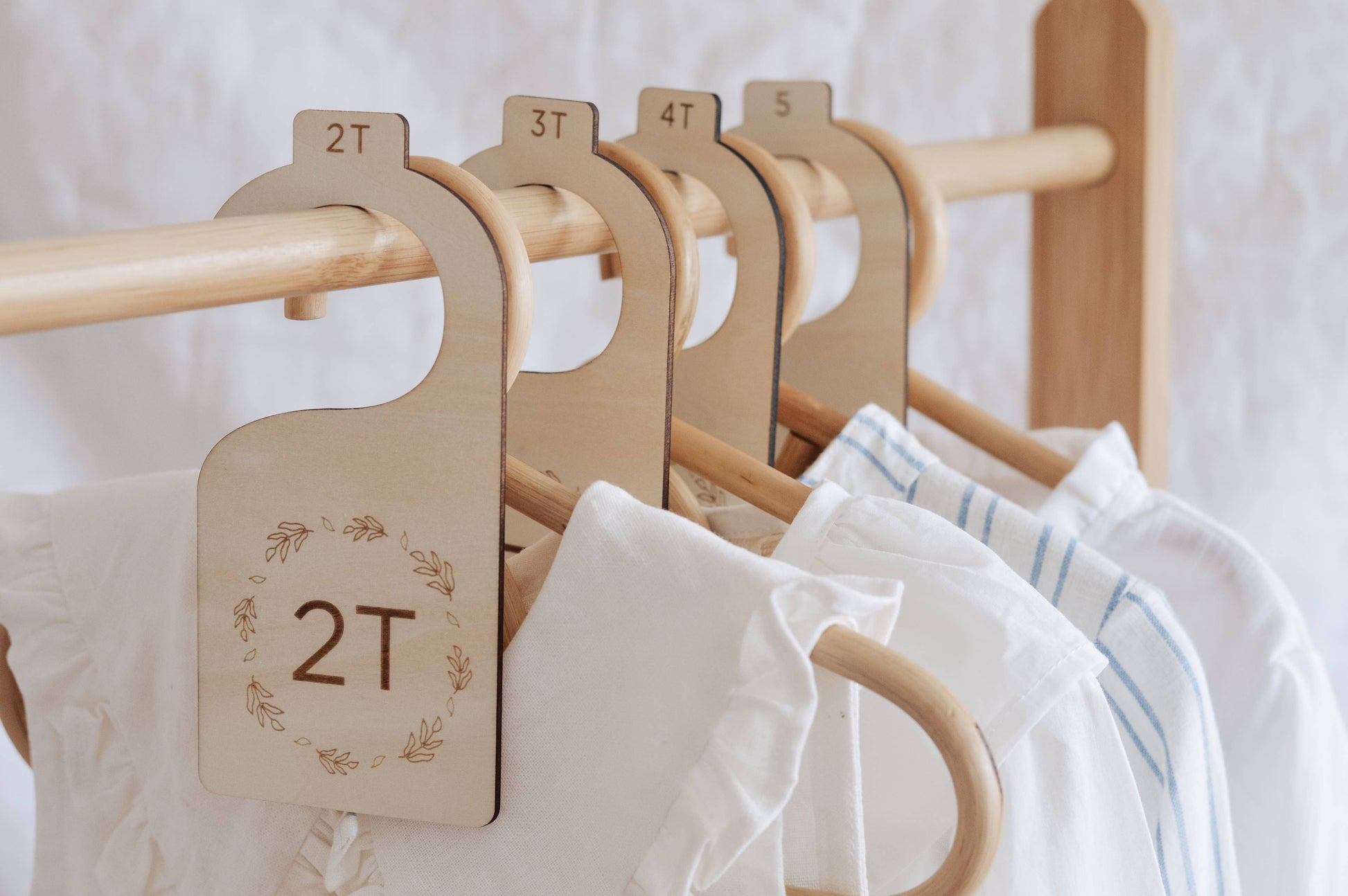 These stylish nursery clothes separators collection set includes plaques for 2T, 3T, 4T, 5, 6 and 7 years.