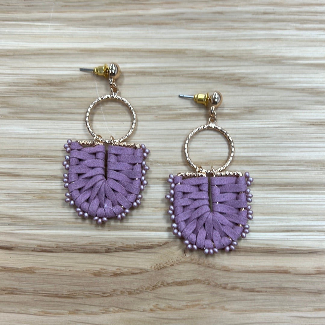Lavender fabric on U shape dangle earring with a beaded edge.