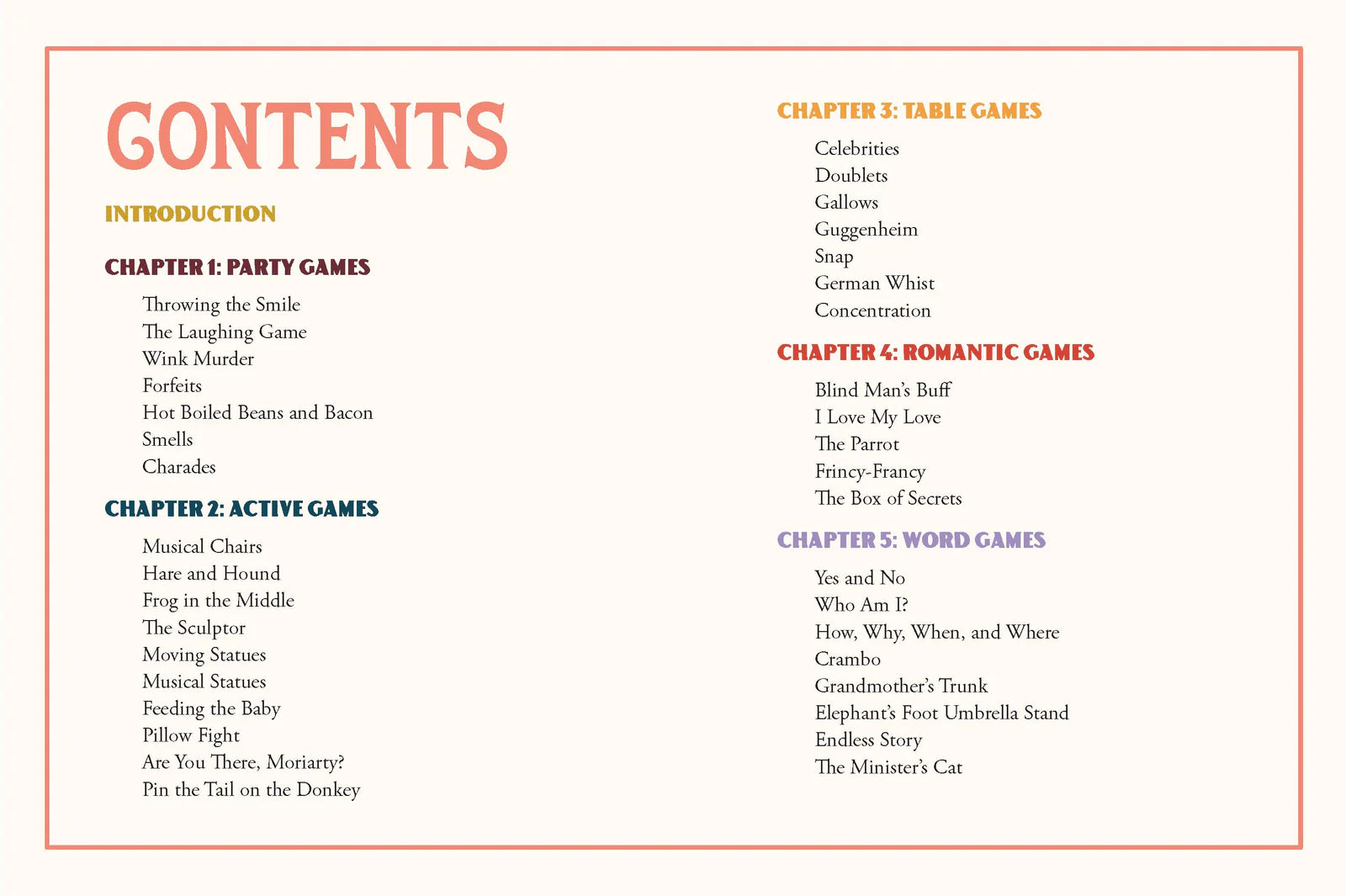 Victorian Parlour Games is a beautifully designed and compact hardcover volume full of the classic, often silly, games played in the late 19th century. The Victorians loved fun and played hundreds and hundreds of party games. This endlessly delightful party games book collects some of the very best for your reference and pleasure.