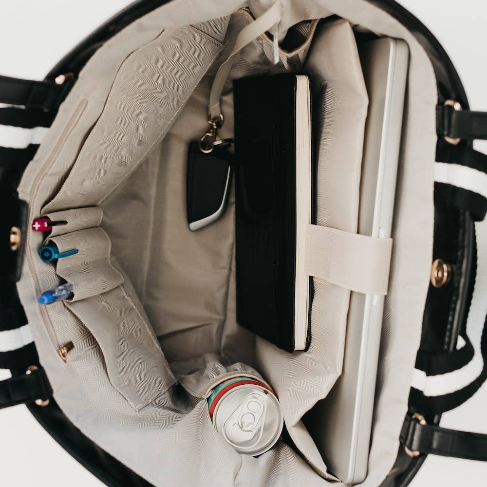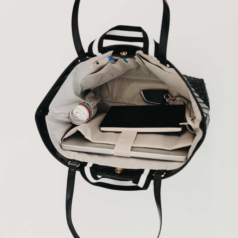 Meet the bag of your dreams, our Woven Tiffany Organized Tote Bag! This must have bag is made from high quality woven vegan leather and includes a vegan leather shoulder strap, a canvas striped hand strap, and a snap closure. Inside the bag, you will find a variety of organizational features including 2 side water bottle pockets, a zipper pocket, many pockets, a key leash, and a secured laptop sleeve. This bag will be your new everyday go-to!