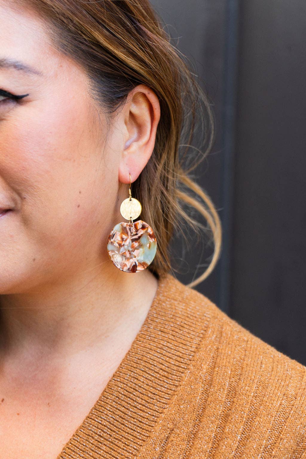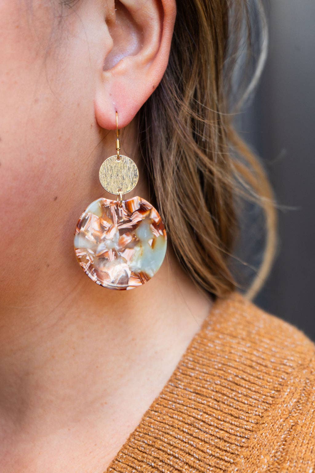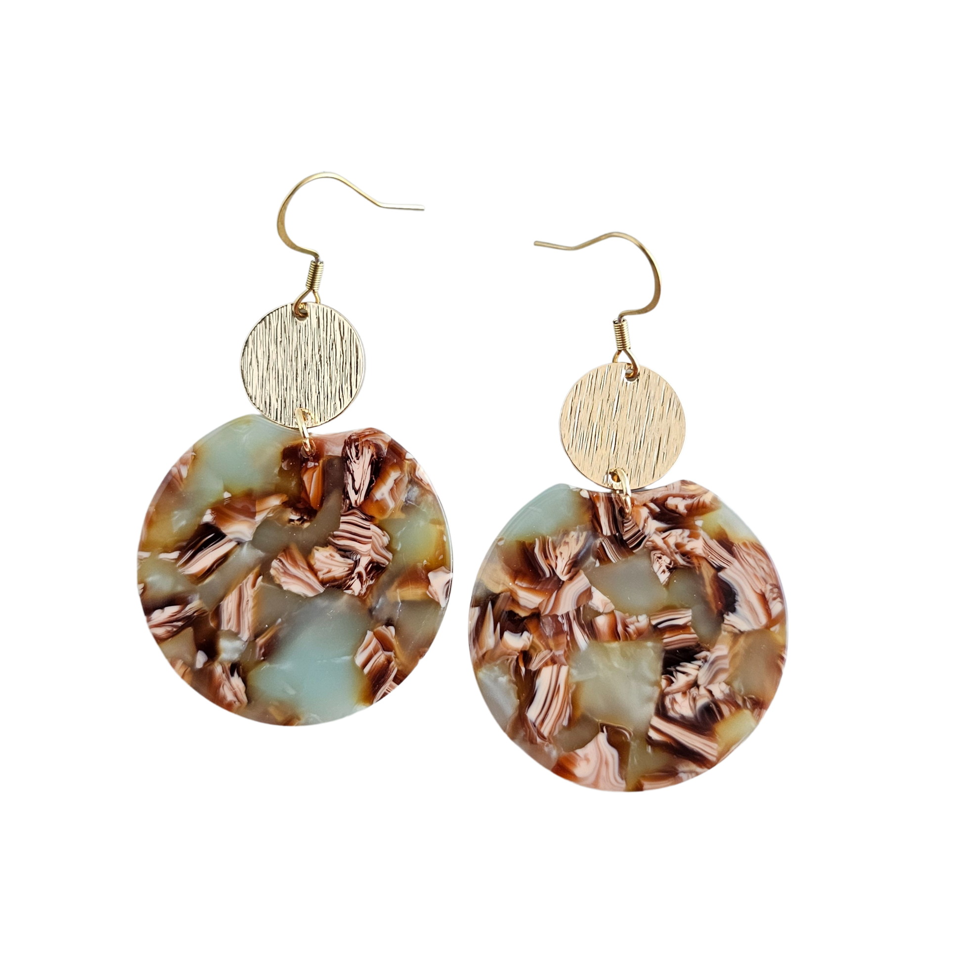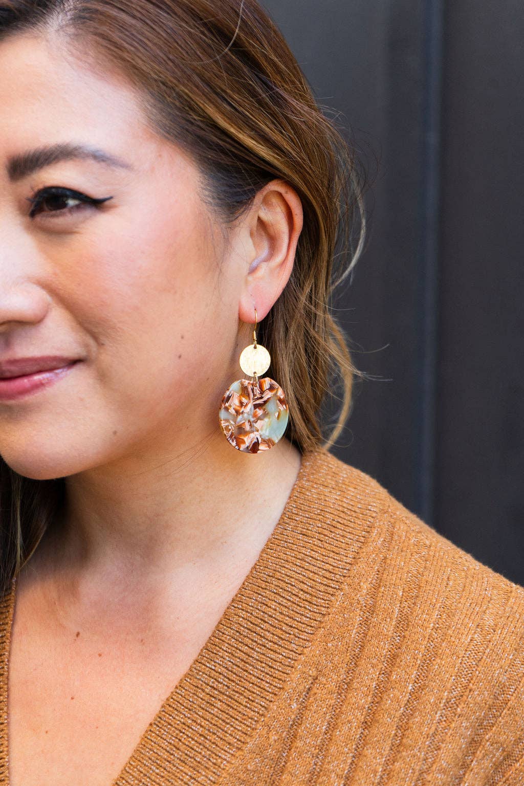 Zoey is a statement earring that really showcases the colors and patterns in these acrylics with a large circle charm. The earring is accented with gold for a sophisticated and elevated look.