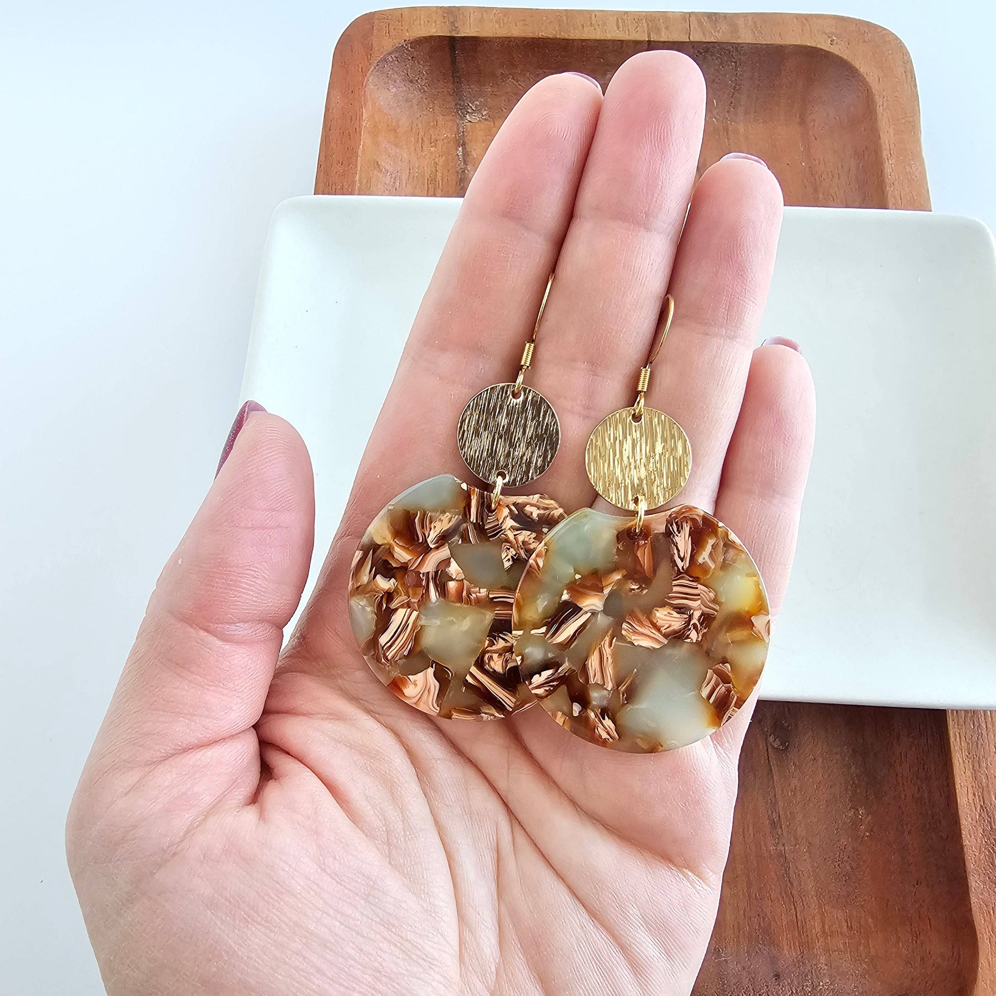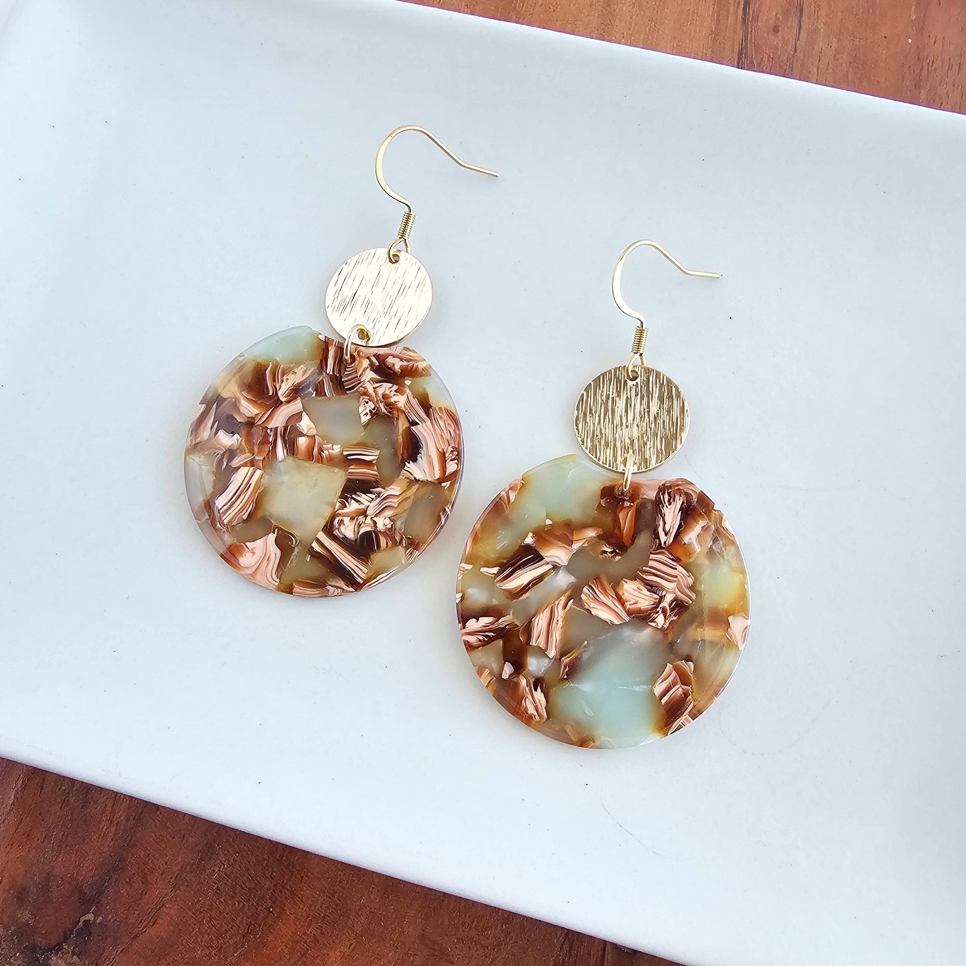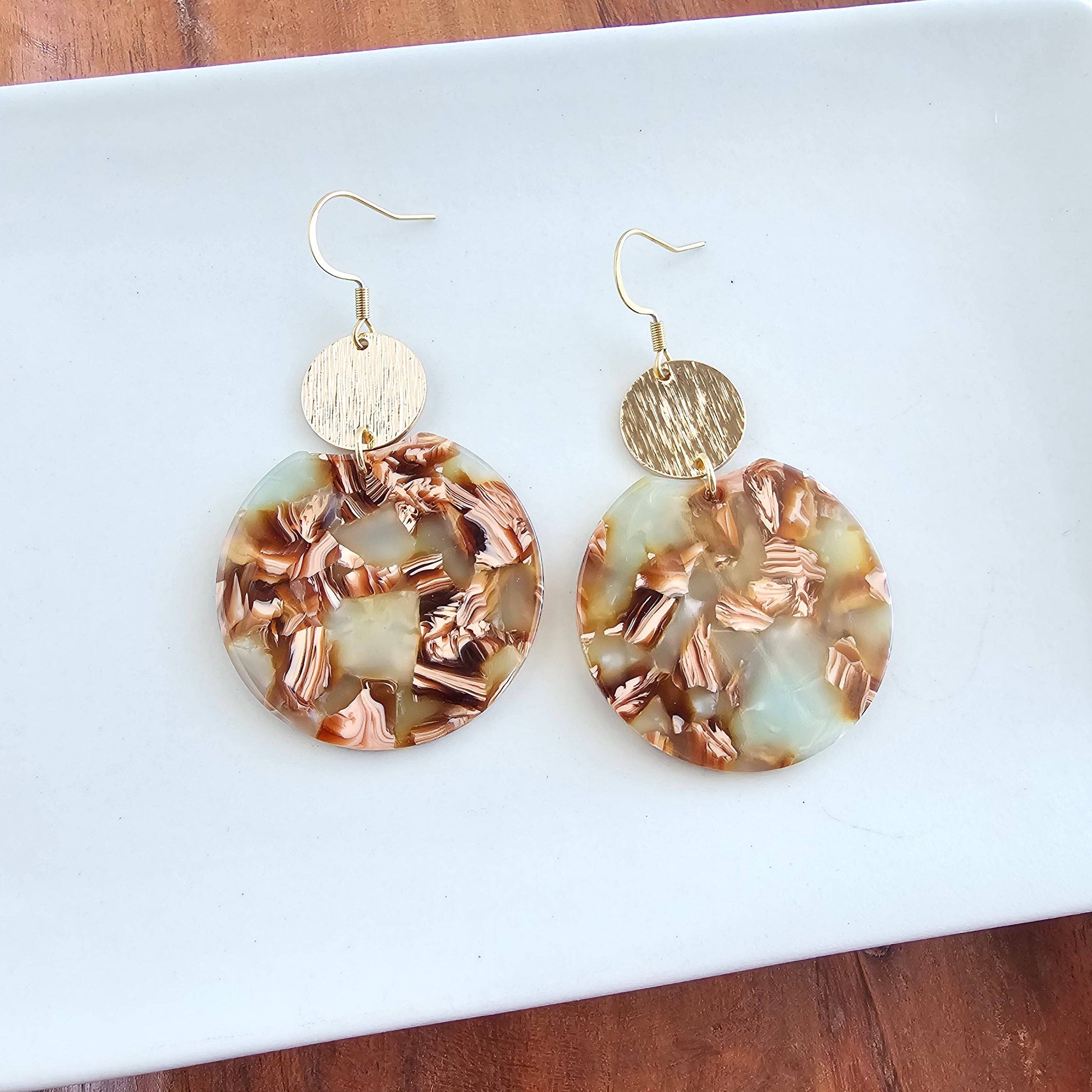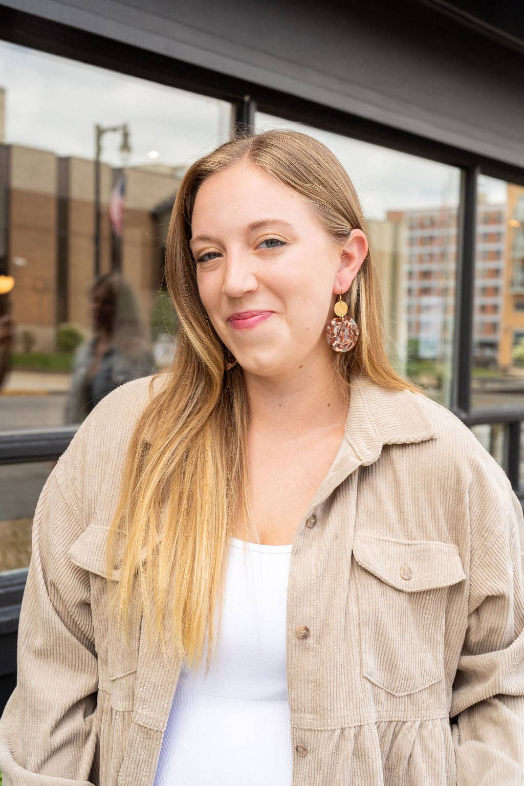 Zoey is a statement earring that really showcases the colors and patterns in these acrylics with a large circle charm. The earring is accented with gold for a sophisticated and elevated look.